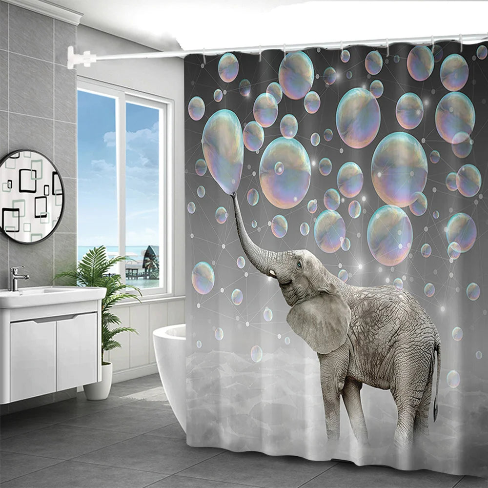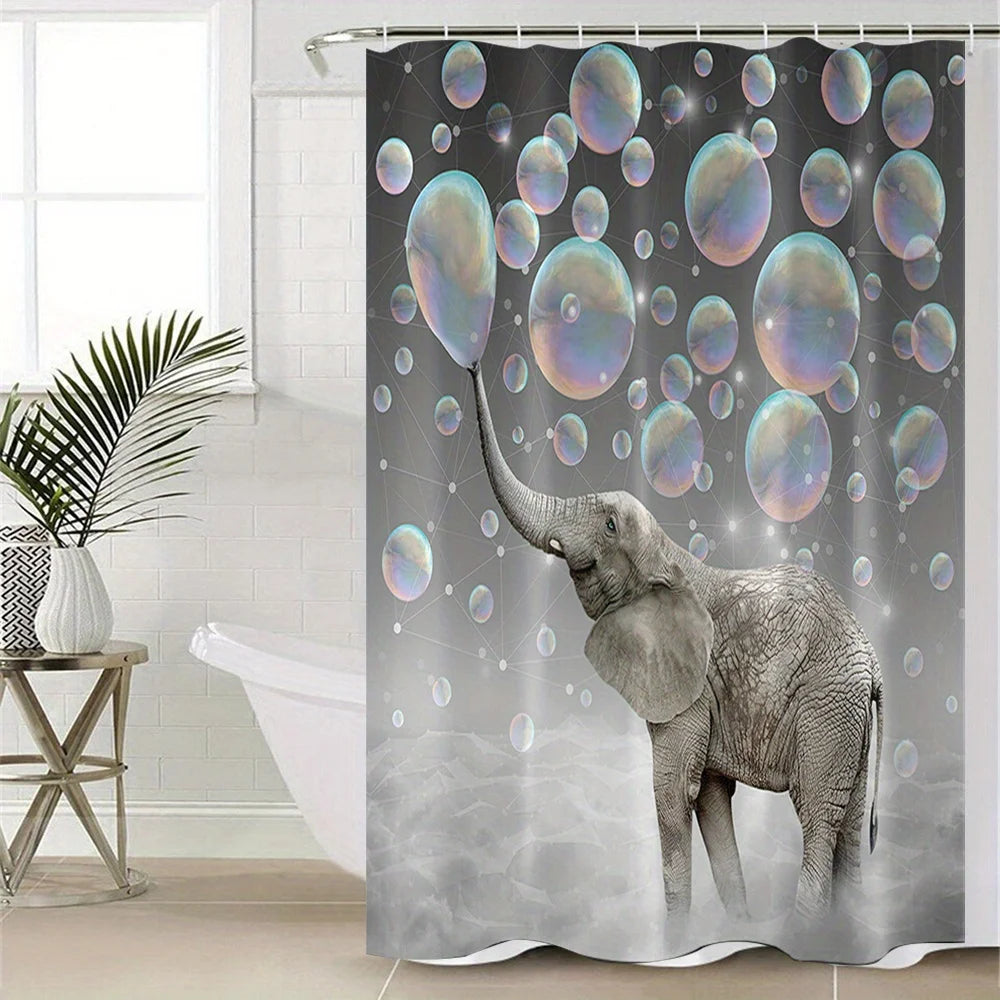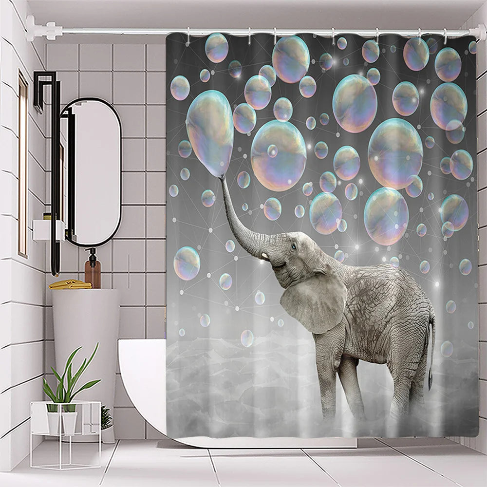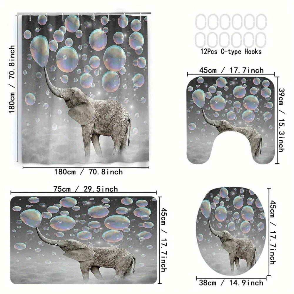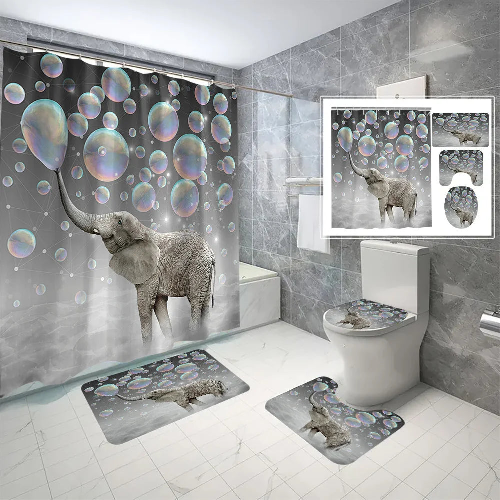Elephant Digital Print Polyester Shower Curtain No Punching Set 4 Pieces