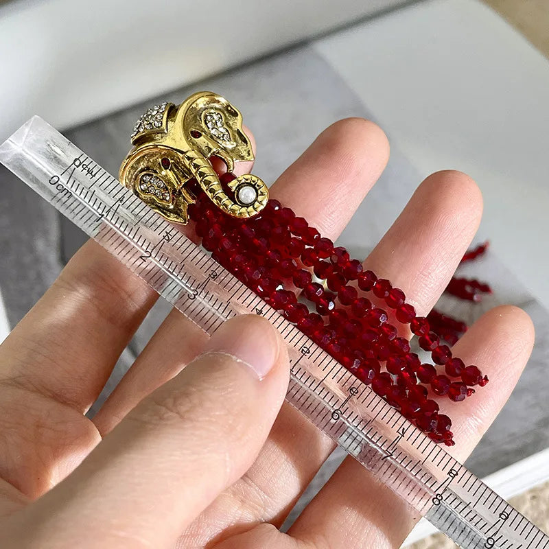 Elephant Earrings Red Crystal Beads Tassels Earrings Vintage Golden