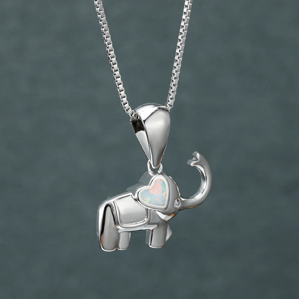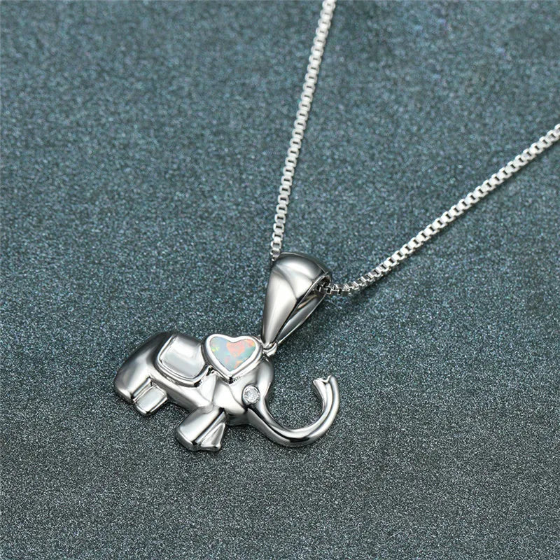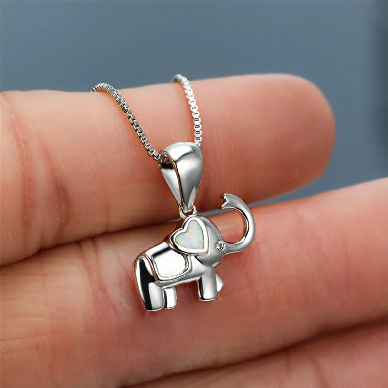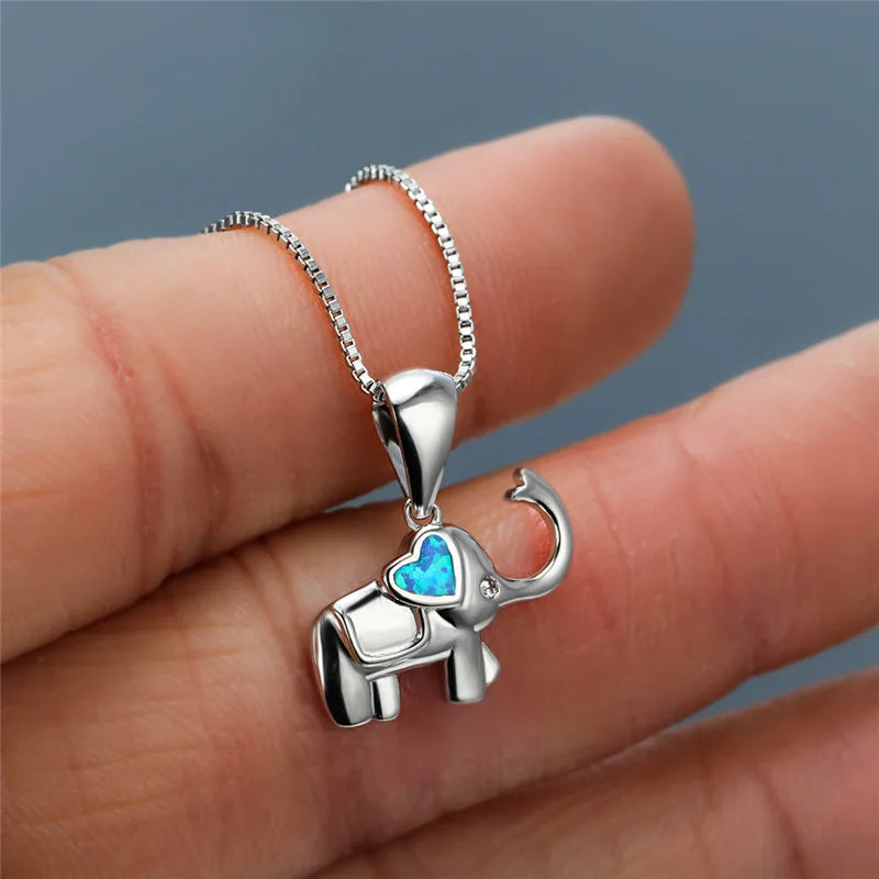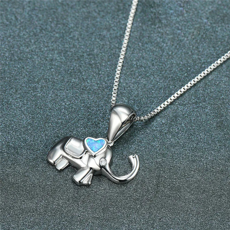 Elephant Heart White Blue Opal Pendant Necklace
