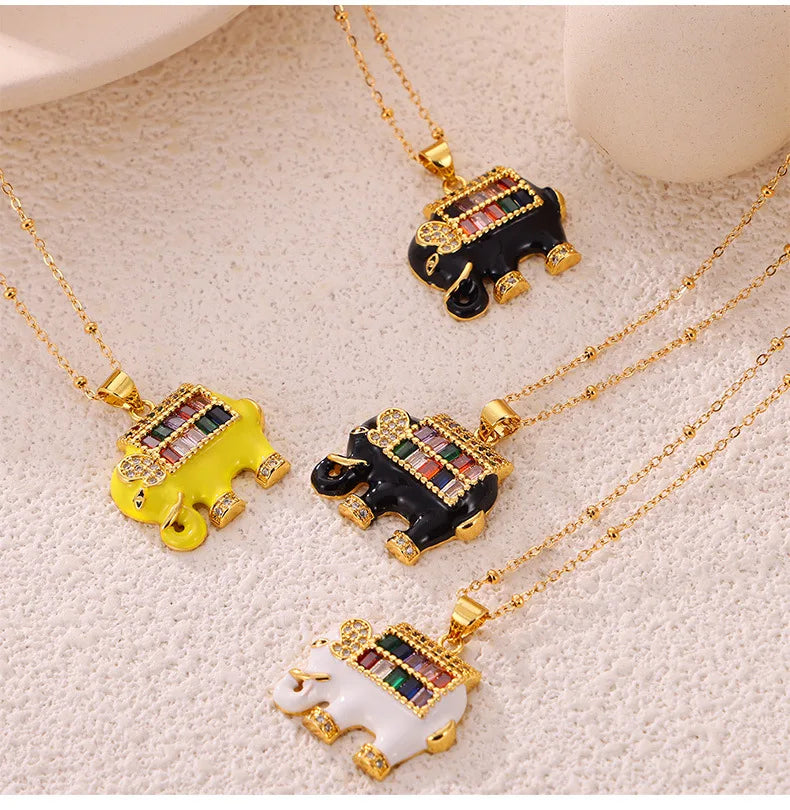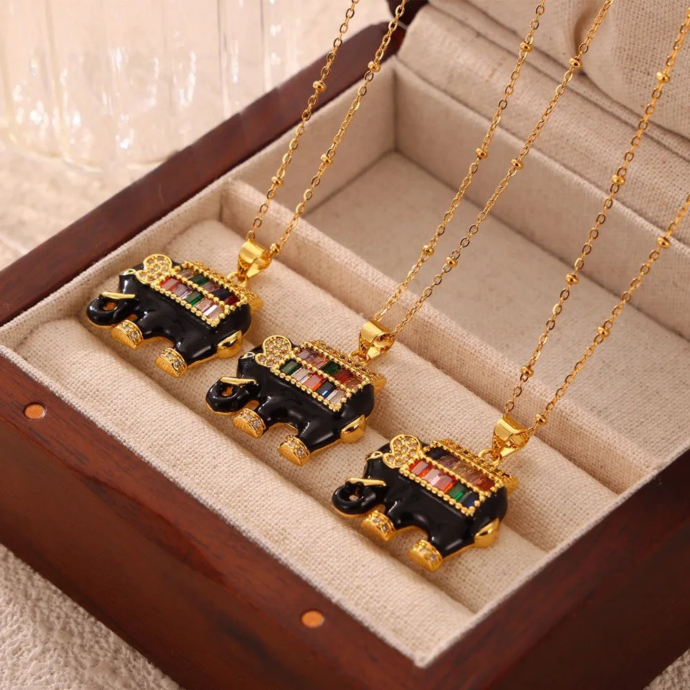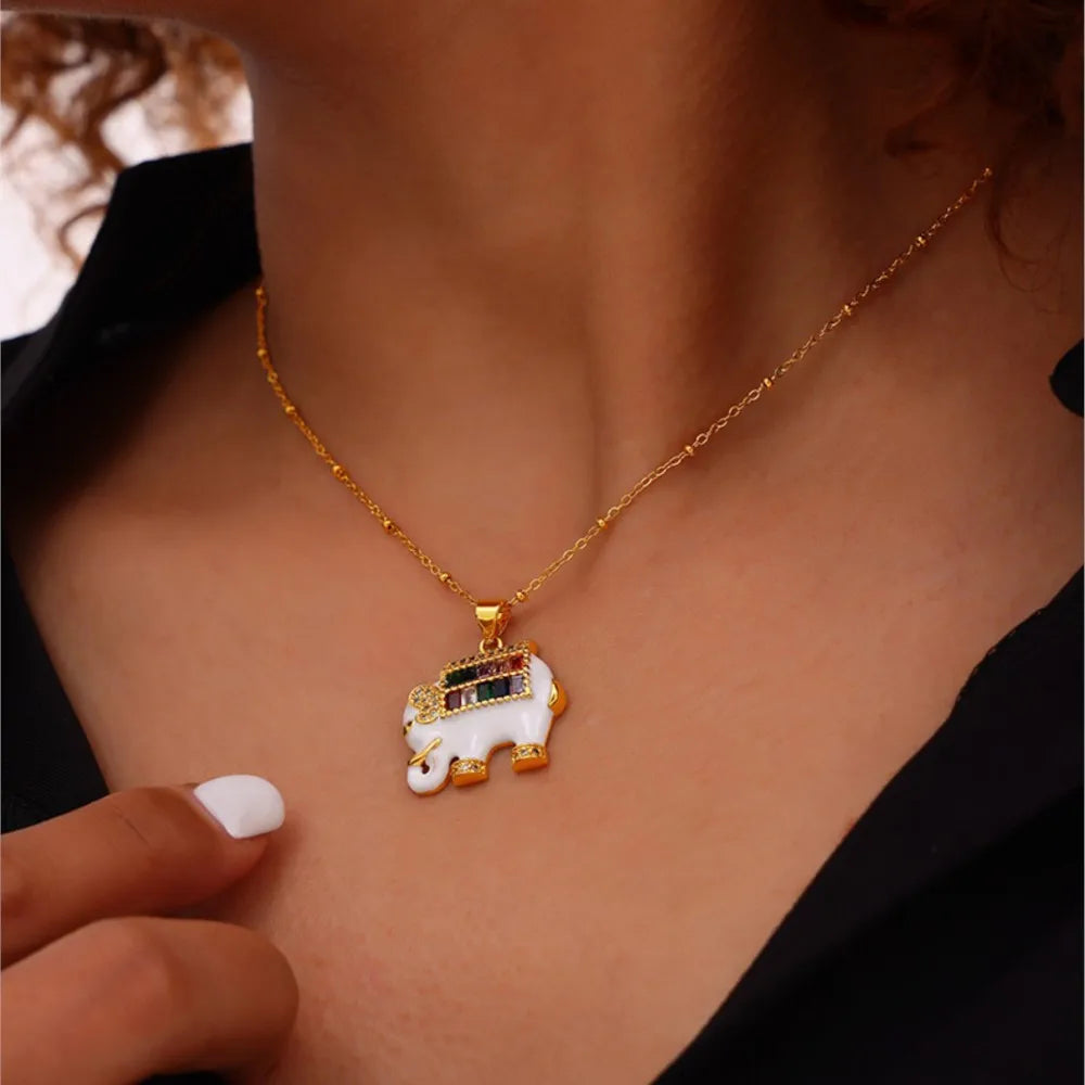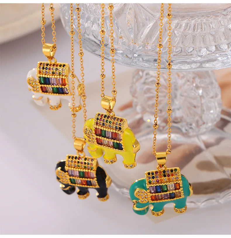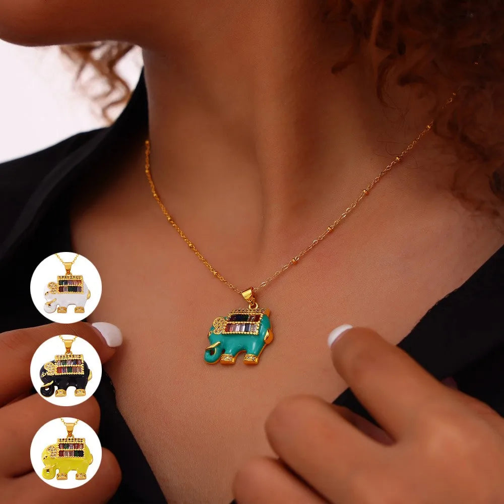 Elephant Pendant Necklace Stainless Steel Colorful Glass Stone