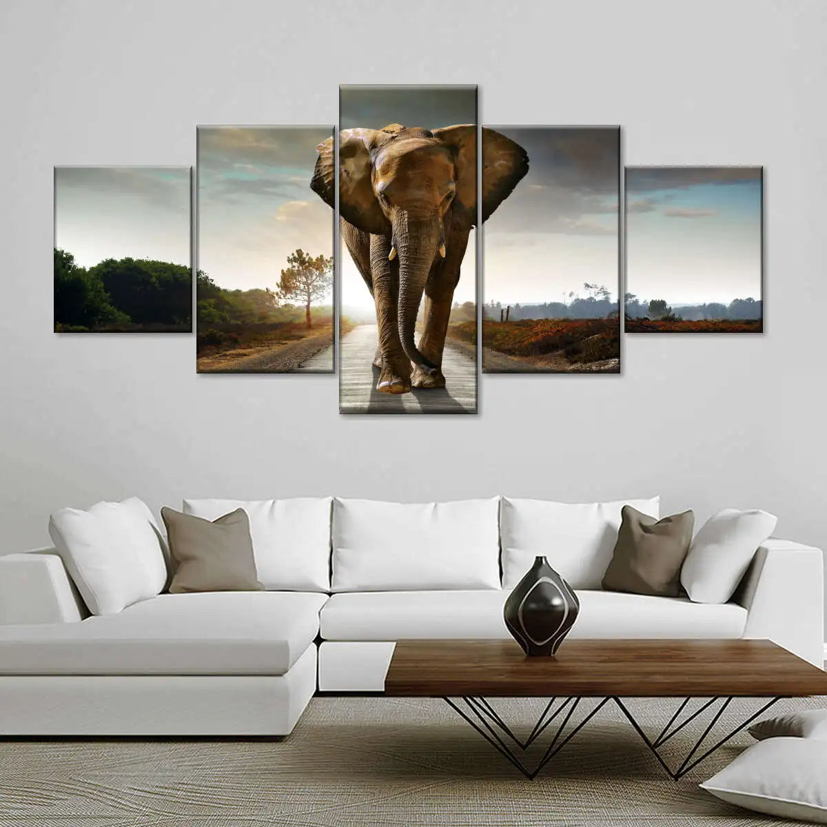 Elephant Sunset Grassland Canvas Painting Prints 5 Piece