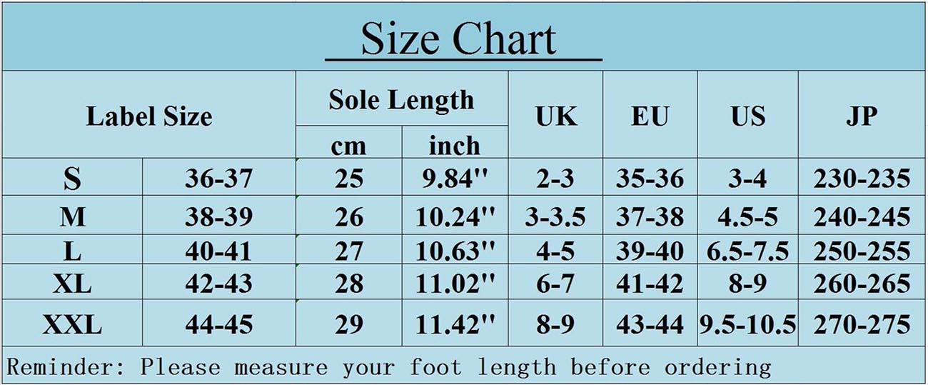 Size: Please refer to the size chart, please measure the foot length before ordering